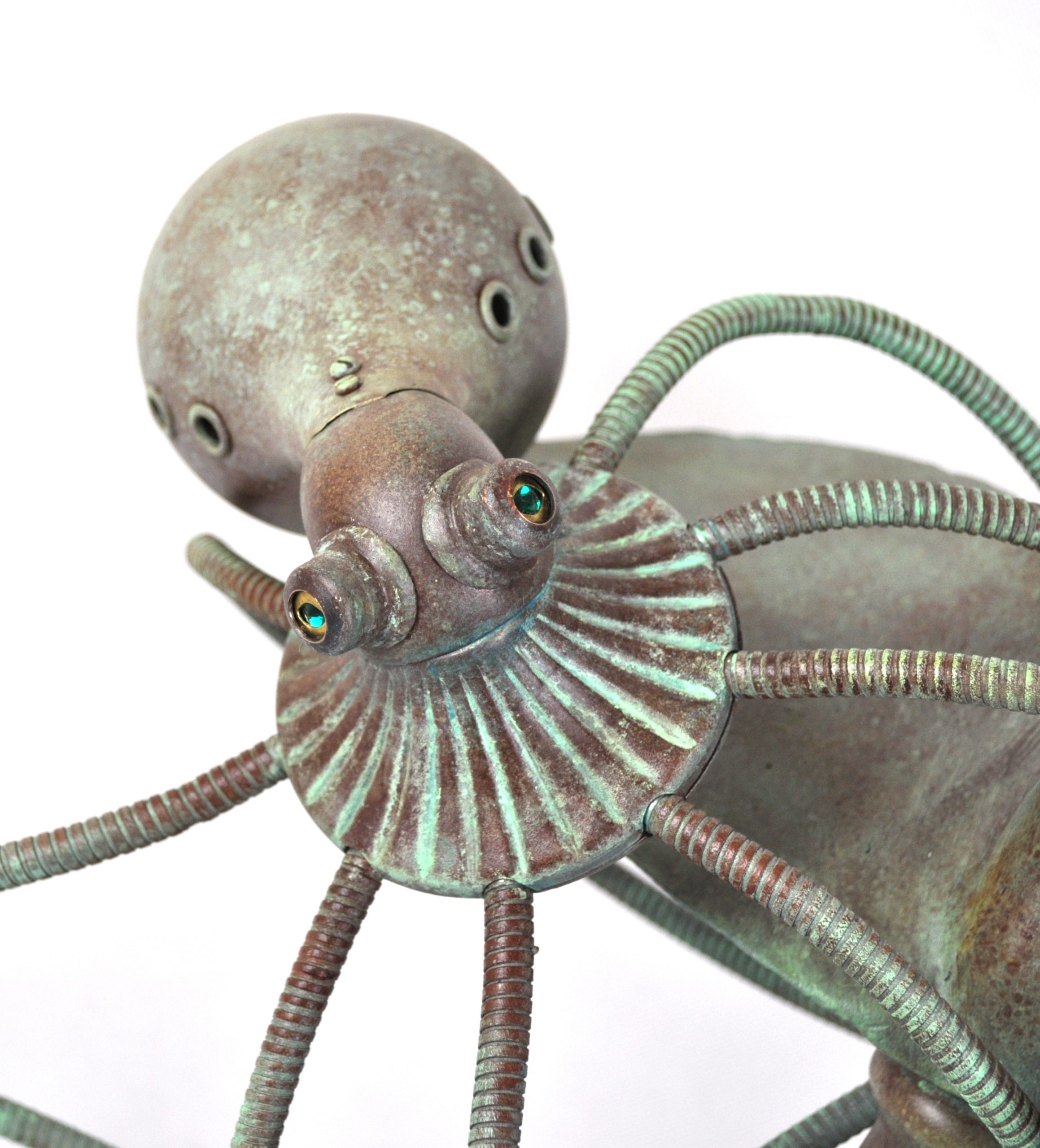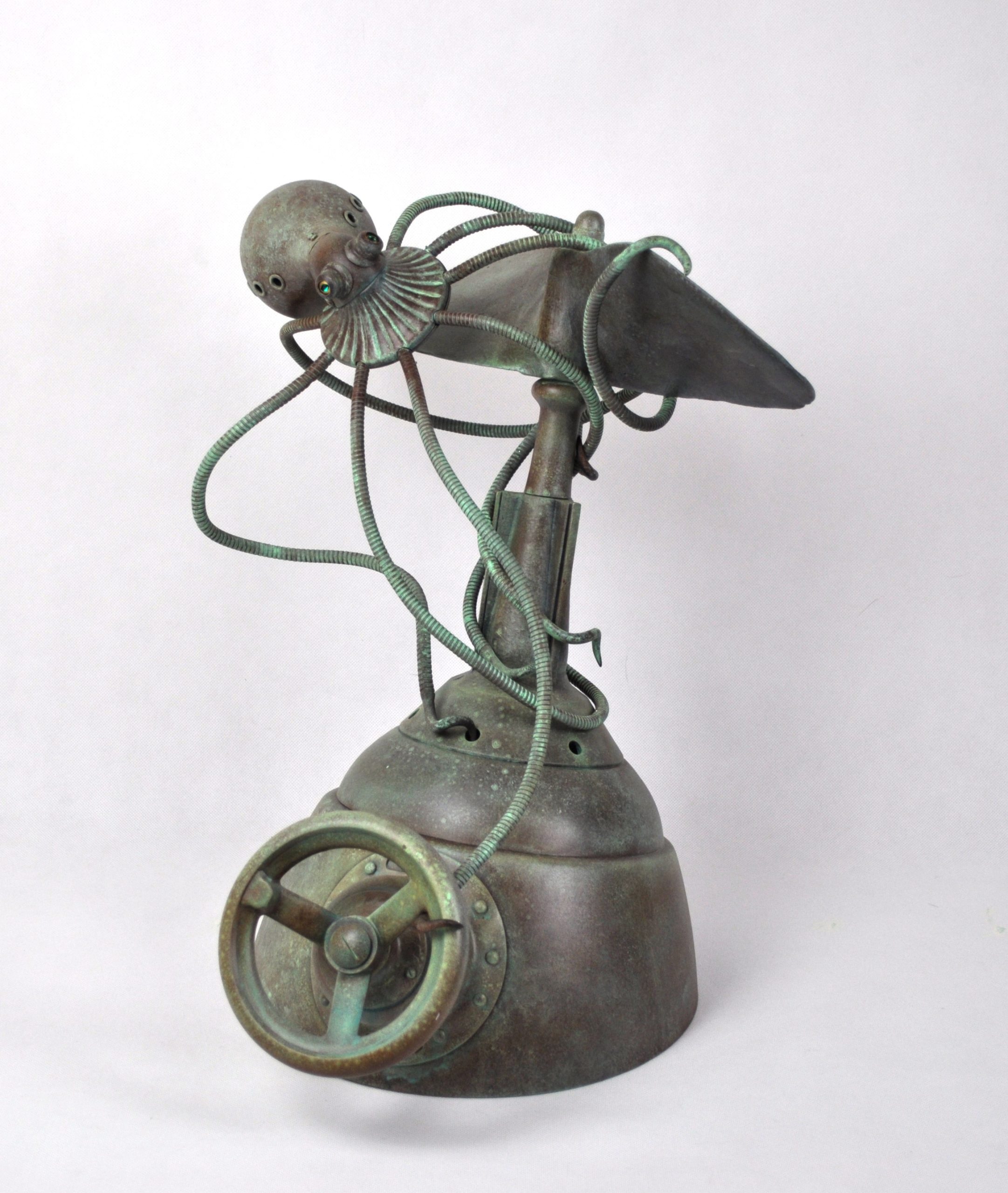 Octopus. I assembled the sculpture from various found objects. The main detail that determined the theme of this sculpture was a bronze propeller that I bought at a flea market. Then I looked for details to make an octopus. Main parts: lamp cover, bronze vase, set of flexible metal hoses with magnetic tips, which are used in car repair. Since the sculpture is assembled from various metals, it was necessary to give it a general shade. I used spray paint, acrylic and varnish, giving it a hint of green patina. The sculpture depicts the remains of a long-sunken ship, which is guarded by an octopus. This is his home, now he is the captain of the ship.